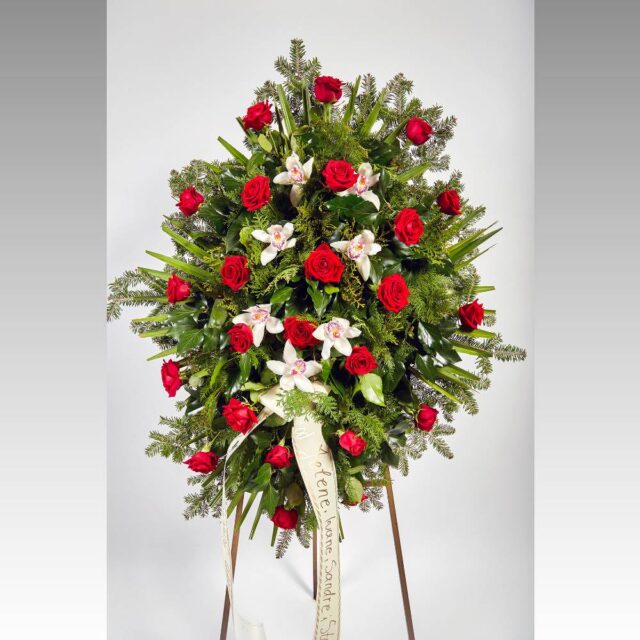 Vijenac od svježeg cvijeća koji se sastoji od palmi, ruža, orhideja i raznog zelenila.
