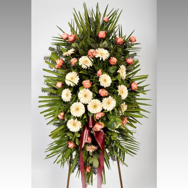Vijenac od svježeg cvijeća koji se sastoji od palmi, gerbera, ruža i raznog zelenila.