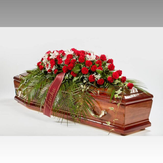Vijenac od svježeg cvijeća koji se sastoji od ruža, orhideja, šlajera i raznog zelenila.